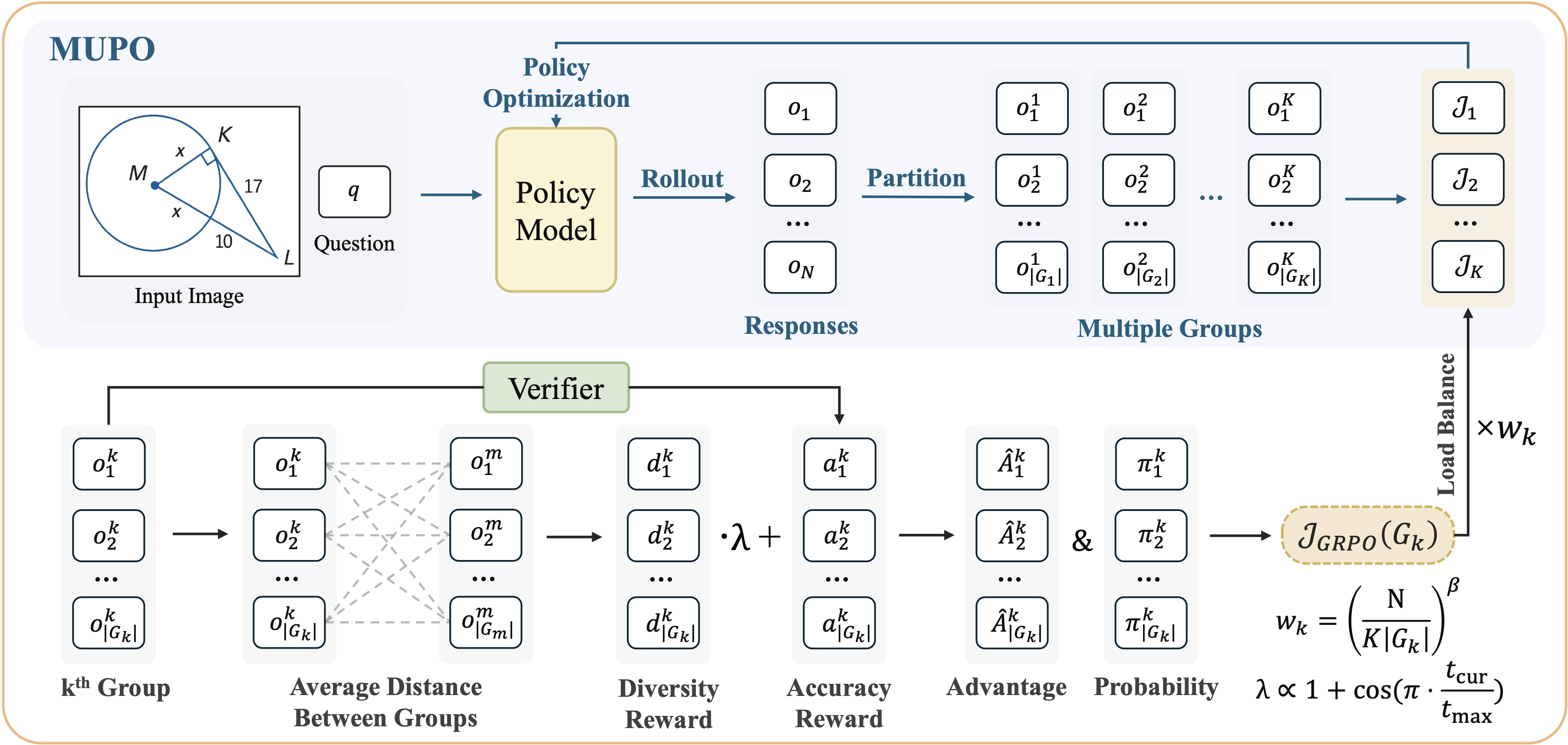 We investigate diversity collapse, a common issue in GRPO models where their thinking is usually limited and lacks diversity. We propose MUPO, which helps VLMs learn to approach the same problem from multiple perspectives.